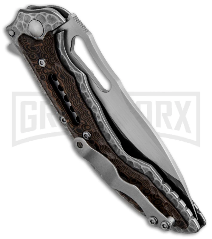 This is the CRKT Small Fossil that flaunts Flavio Ikoma’s design and style. The G-10 overlay combined with stainless steel for the handle is featuring a hammered finish design. The flipper opener rides smoothly on an IKBS ball bearing pivot. Included is a right hand, deep carry, tip-up pocket clip.