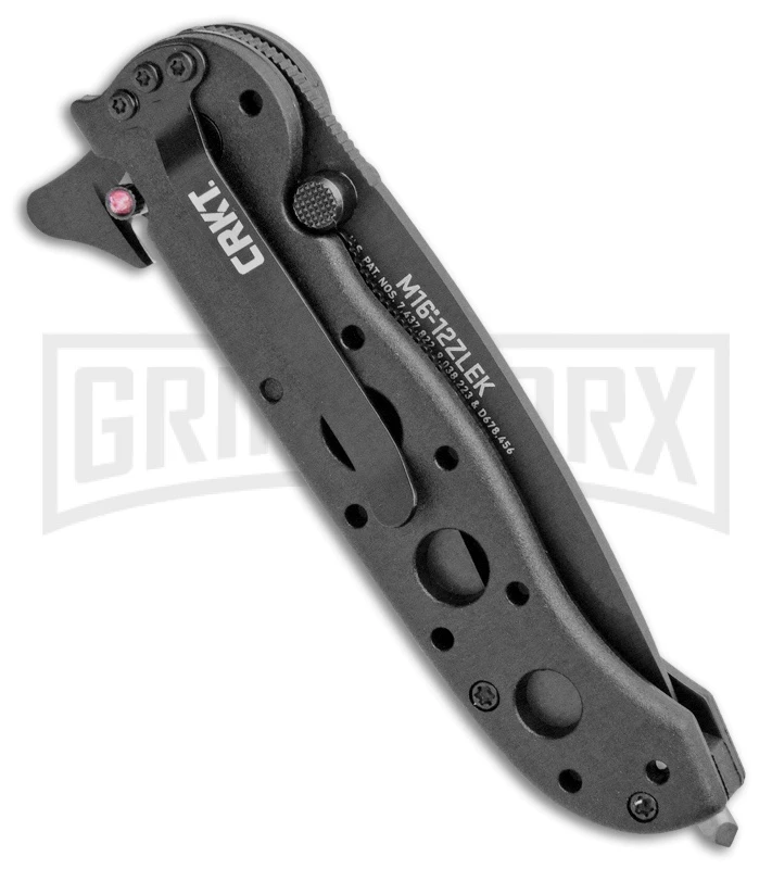 The CRKT M16-12ZLEK features a hollow ground Tanto style blade with a black Ti-Nitride finish and a partially serrated edge. The blade is easily opened with the dual thumb studs or a push of the Carson Flipper. The Teflon bearings at the blade pivot and an adjustable pivot screw allow for perfect blade action.