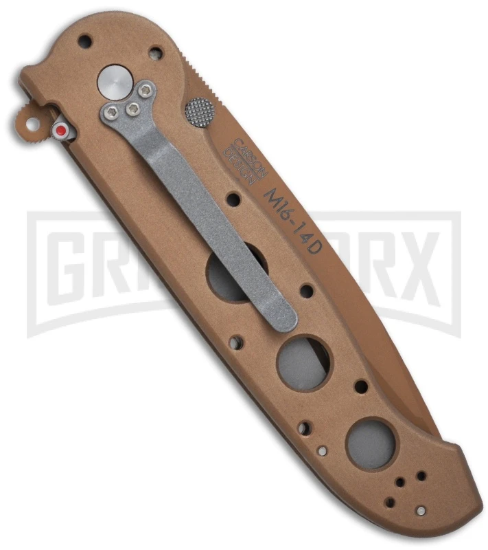The M16-14D has a titanium nitride coated blade with a partially serrated edge. The aluminum frame is desert tan camo finished, while the steel hardware and lock are matte bead blast finished. The Carson Flipper and Teflon bearings at the blade pivot allow quick and smooth one-hand opening. The pocket clip is 4-way reversible for every possible carry type, but not designed for tip-up in-pocket carry.