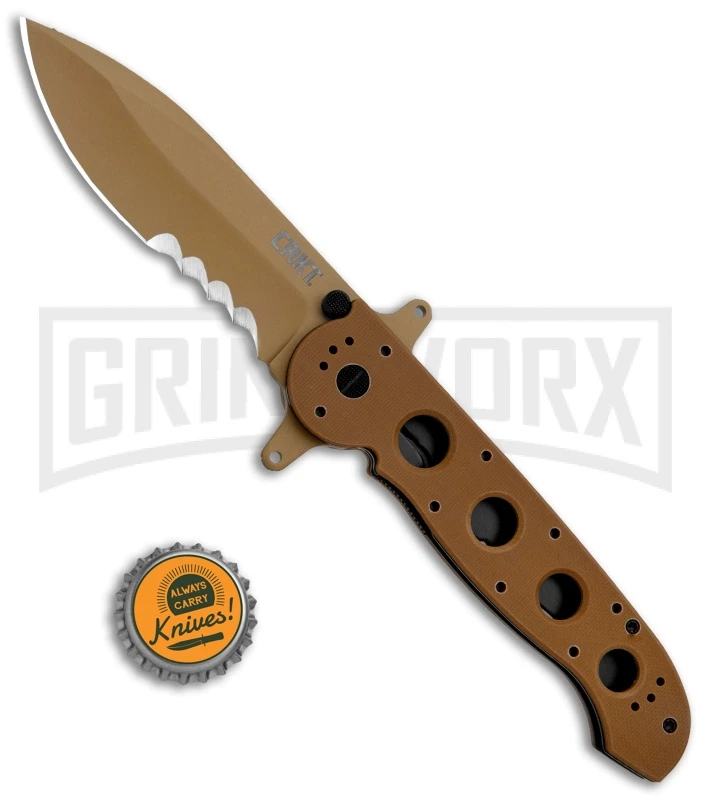 M21-14DSFG has a Desert Tan finished blade and handle. The 8Cr14MoV stainless steel blade is a deep-bellied spear point style with a hollow grind and a combination Veff serrated edge. One-hand opening is made simple with dual thumb studs and a Carson Flipper for quick deployment.