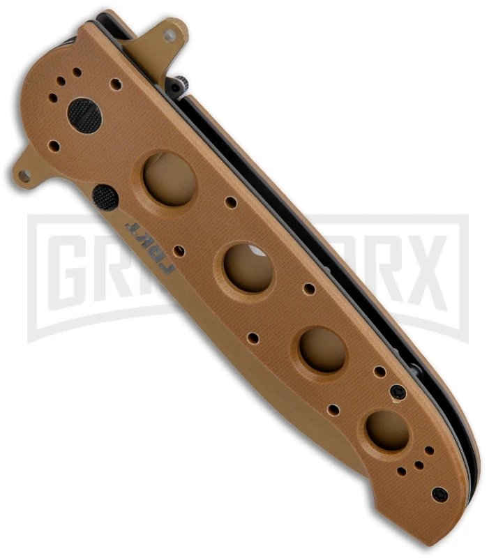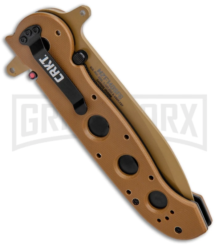 The Kit Carson designed CRKT M21-14DSFG “Big Dog” Desert Tan G-10 Special Forces knife features a stainless steel InterFrame build with textured G-10 scales and a combination of features requested by military procurement specialists. The stainless steel locking liner with friction grooves gives positive locking and is paired with CRKT’s patented AutoLAWKS automatic safety, which turns the folder into a virtual fixed blade automatically. The open build handle allows two Carson Flippers to be incorporated, resulting in a true hilt.