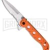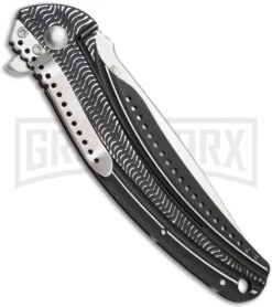 The modified drop point blade has a high hollow grind, swedged top edge, and a high satin finish. Steel is premium Acuto, stainless, noted for its high chromium and molybdenum content and hardness of 59-60 HRC. It is instantly opened by pressing the blade flipper with either hand. For safety while closed, the blade has a ball detent.