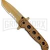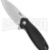 The modified drop point blade has a high hollow grind, swedged top edge, and a high satin finish. Steel is premium Acuto, stainless, noted for its high chromium and molybdenum content and hardness of 59-60 HRC. It is instantly opened by pressing the blade flipper with either hand. For safety while closed, the blade has a ball detent.